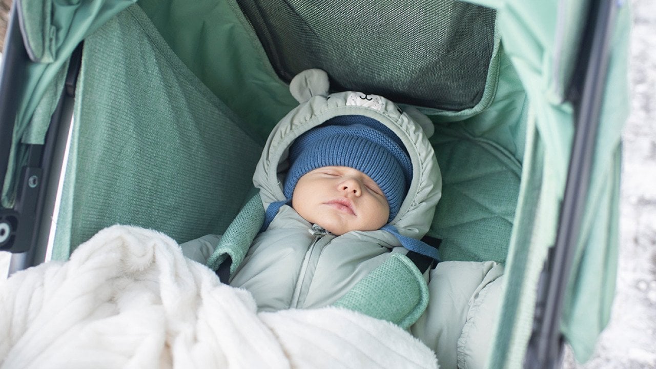 A baby in winter clothes sleeping in a green stroller outdoors.