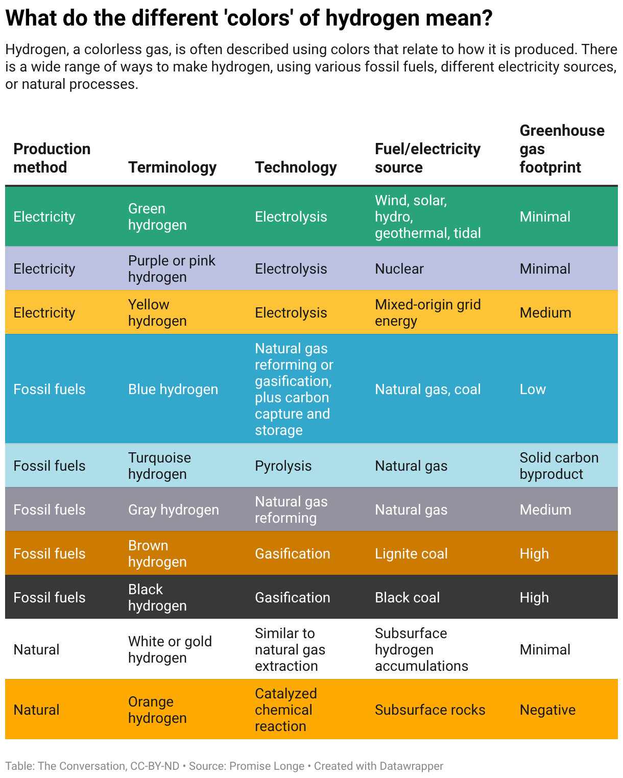 To describe each source of hydrogen, energy researchers like me, and the energy industry as a whole, use a range of colors. In general, “gray” and “blue” hydrogen are made by burning fossil fuels, with blue hydrogen incorporating technology that captures the carbon dioxide produced in the process to reduce emissions. “Green” hydrogen comes from renewable‑energy‑powered electrolysis, using electricity to split water into hydrogen and oxygen. “White” or “gold” hydrogen occurs naturally underground and can be extracted directly with minimal processing.