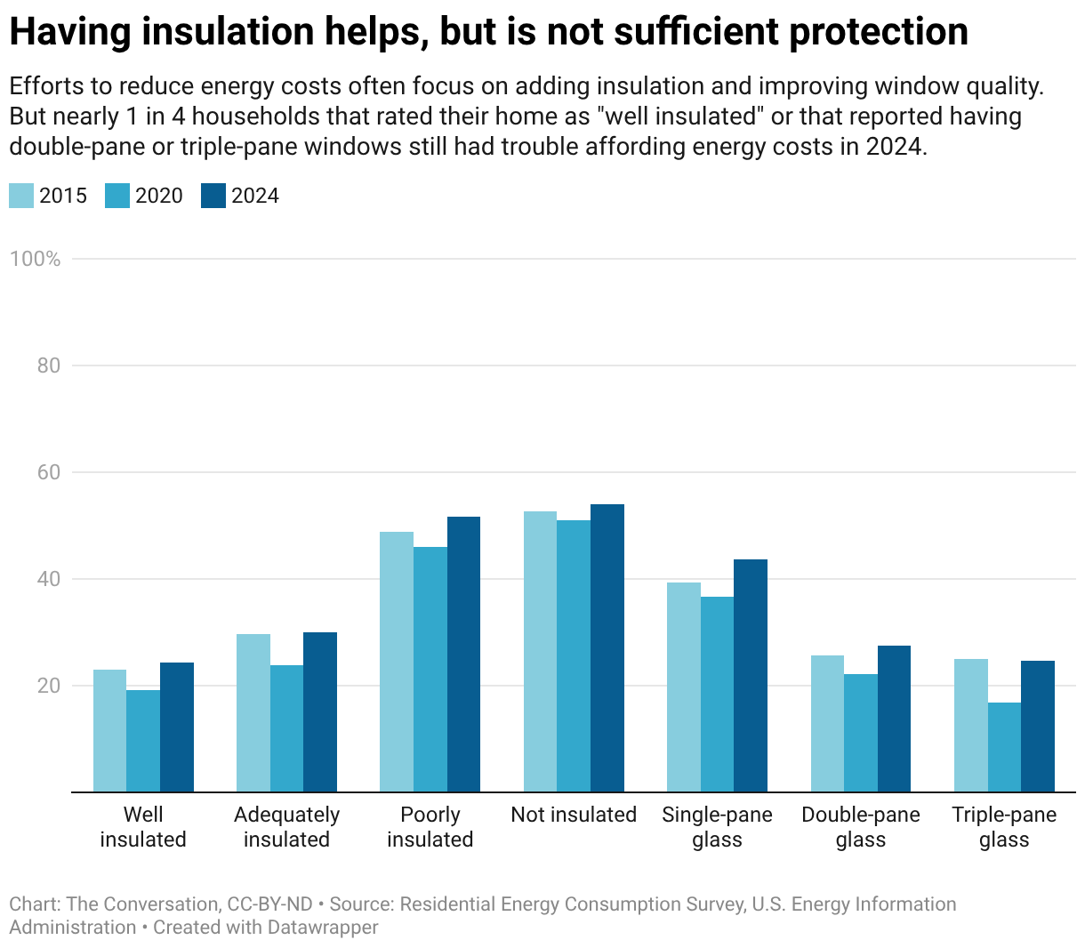 An efficient home has long been considered a solution to high energy bills. But the data shows that’s not enough anymore. People who live in well-insulated homes and those with double-pane windows saw their likelihood of energy insecurity rise by a similar amount as those who live in poorly insulated homes.