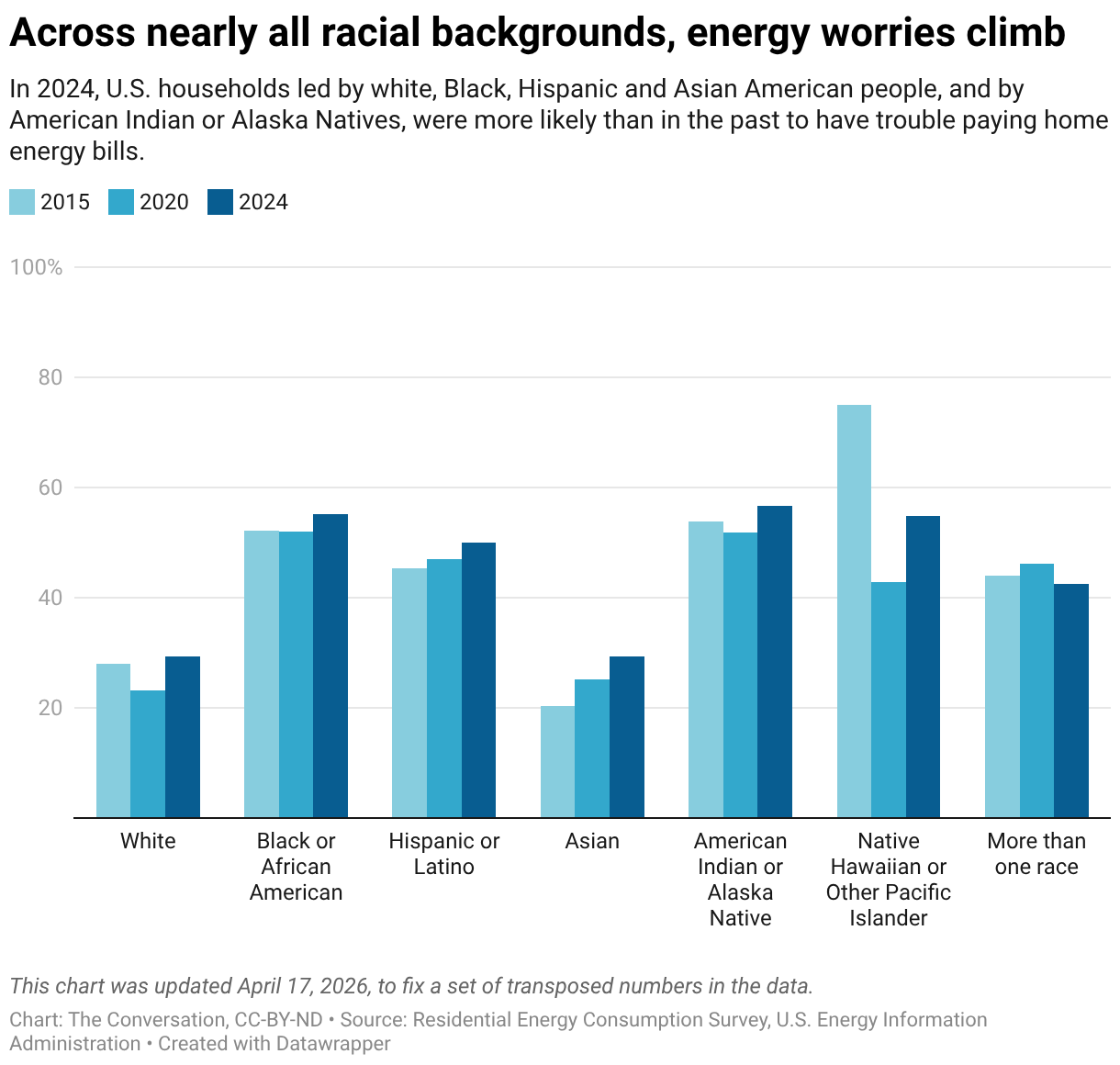 There were also racial differences. Historically, Black, Hispanic and American Indian households have been disproportionately likely to have trouble affording energy bills. And between 2020 and 2024, those households’ risk grew.