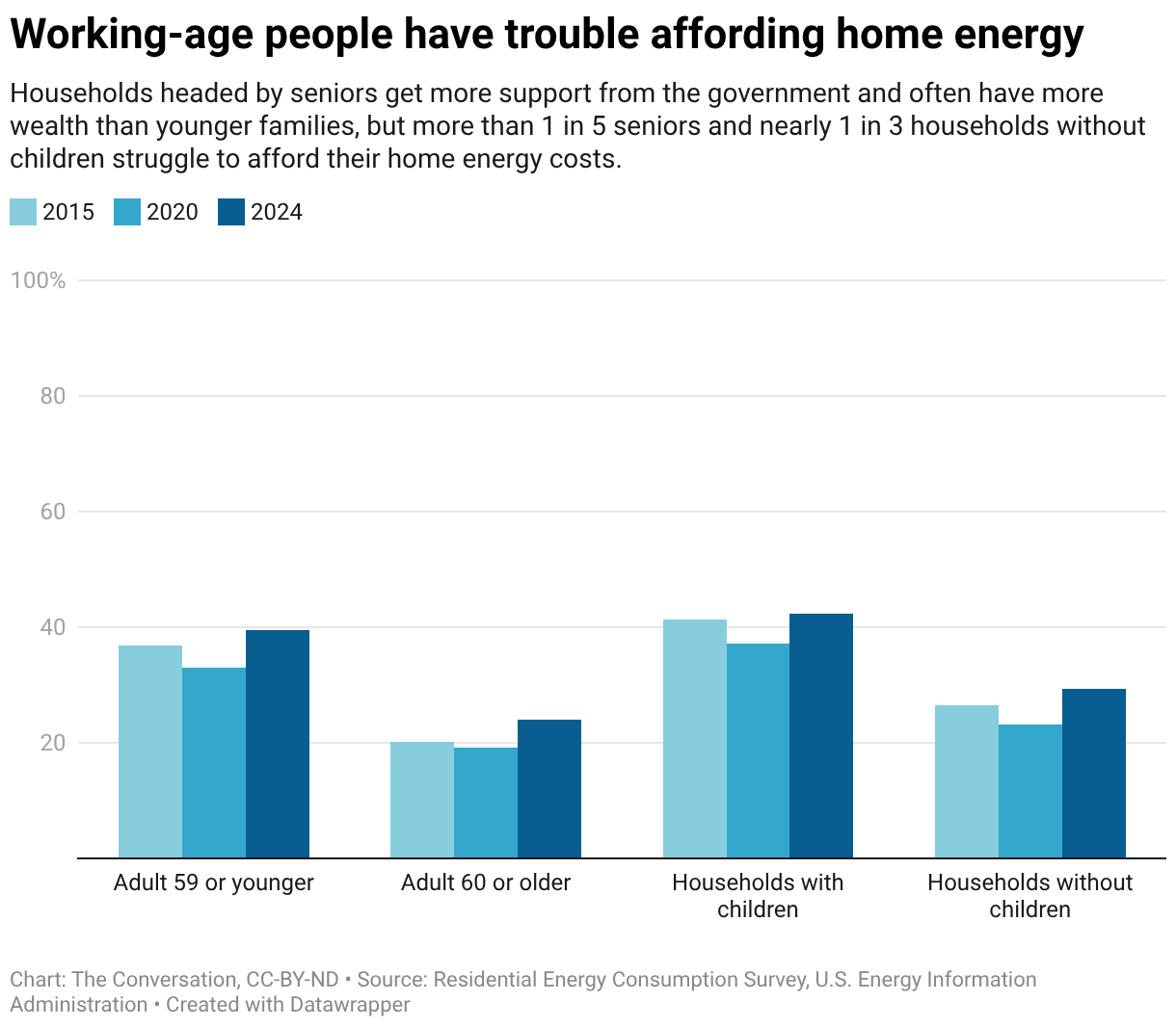 Seniors have historically been among the most protected, partly by the designs of government and corporate programs to assist with energy costs and partly because wealth usually peaks in later life. Even so, the share of older Americans experiencing energy insecurity climbed to 1 in 4 in 2024 from roughly 1 in 5 in 2020 – a sign that long-standing safeguards for older Americans are no longer making as much of a difference as they used to.