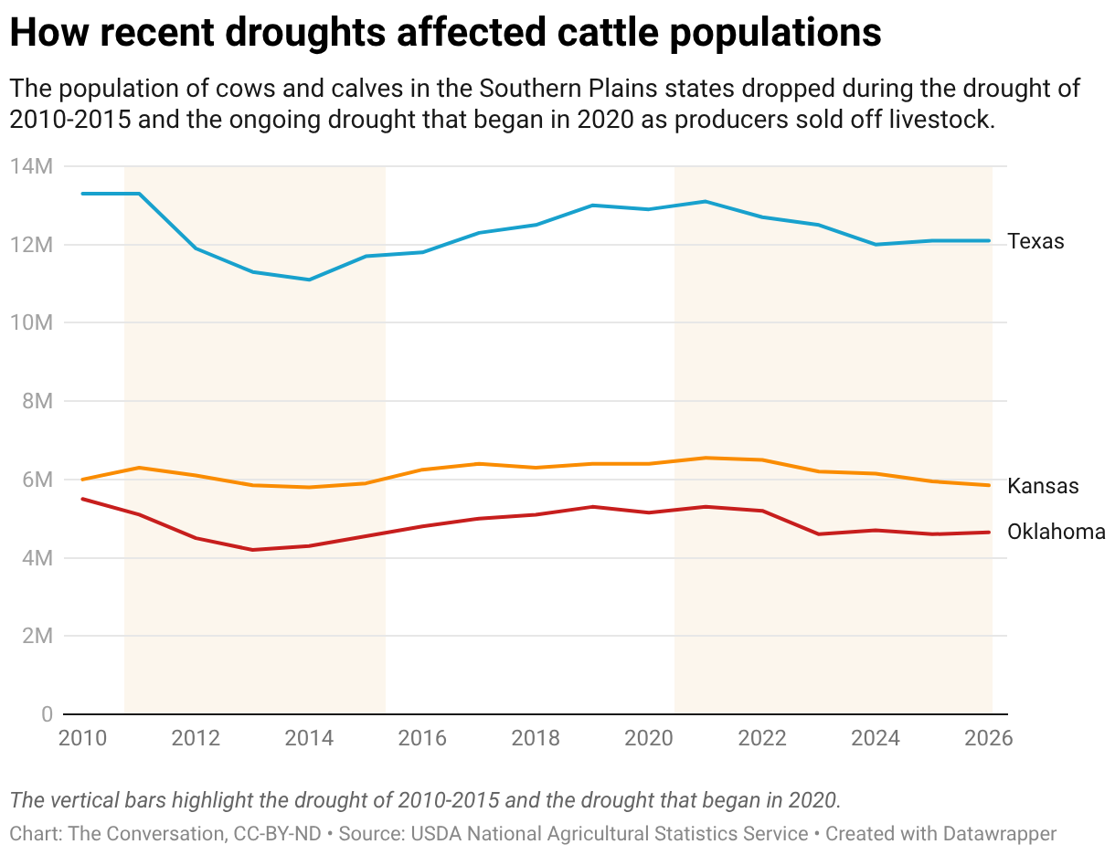 Many cattle producers and rangelands were still recovering from a severe 2010-2015 drought when a flash drought hit western Texas in spring 2020, marking the beginning of the current multibillion-dollar, multiyear and multistate drought. Ample spring rainfall in 2025 and severe flooding in central Texas that year weren’t enough to end the drought, and a powerful winter storm in late January 2026 missed the driest parts of the region.
