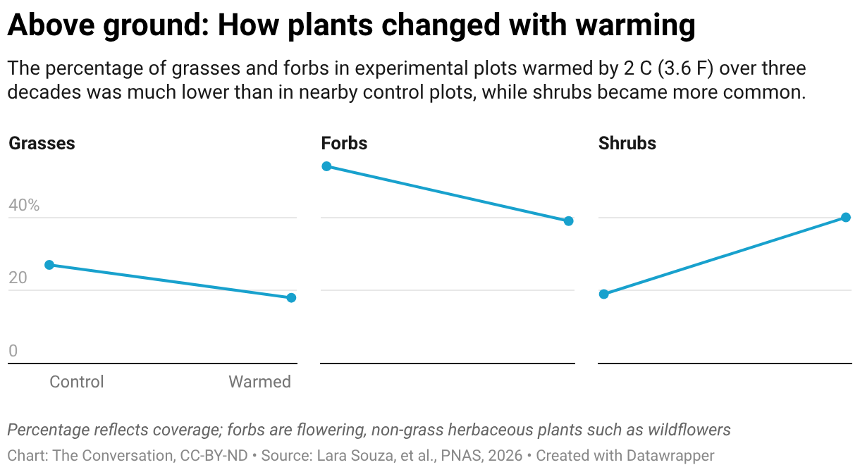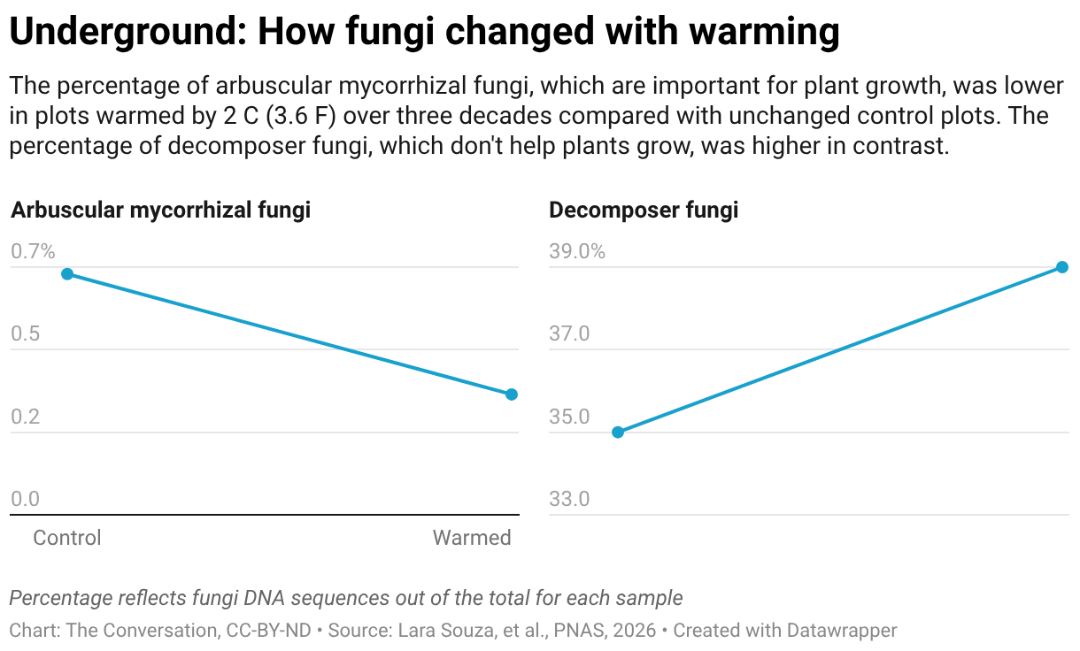 Above ground, the plots shifted over that time from predominantly grassland to more desertlike shrublands. Under the surface, we found something else: There were noticeably fewer beneficial mycorrhizal fungi, which left plants less able to acquire nutrients or buffer themselves from environmental stressors like freezing temperatures and drought.