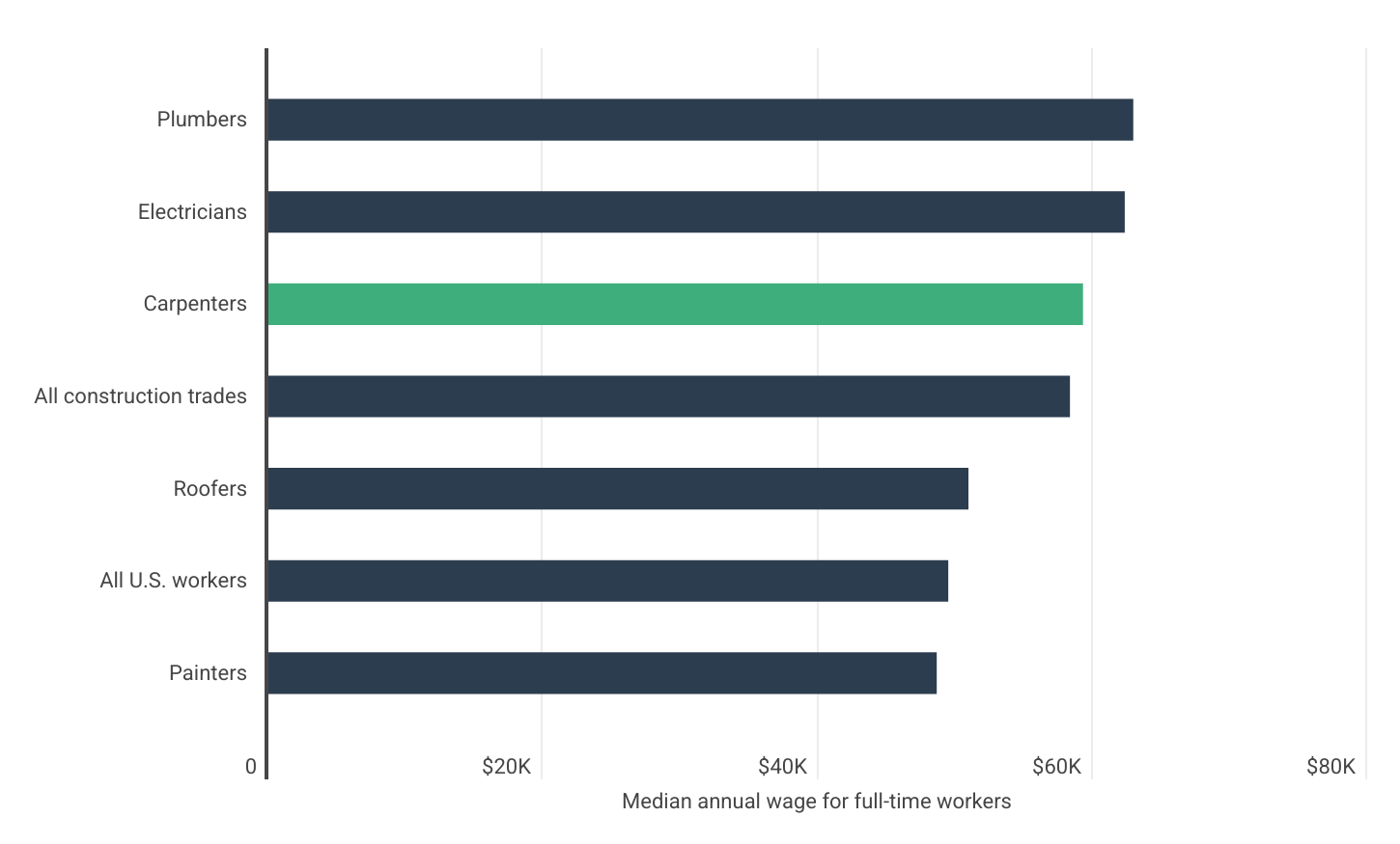 - Median annual wage for carpenters (adjusted): $56,851