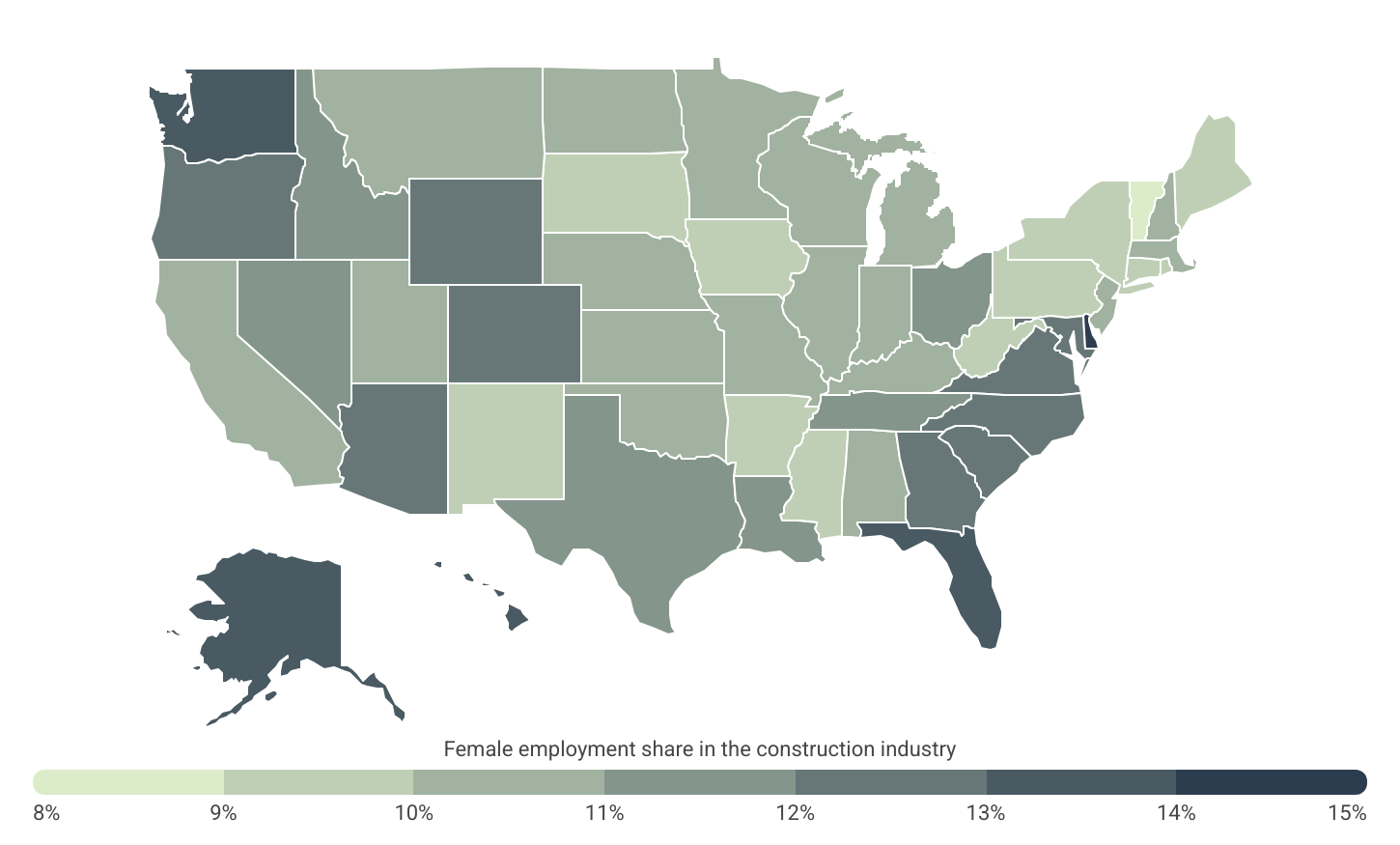 While the construction industry remains male-dominated nationally, the underrepresentation of women in construction is less pronounced in certain parts of the country. This variation highlights regional differences in workforce dynamics, compensation levels, and diversification efforts within the industry.
